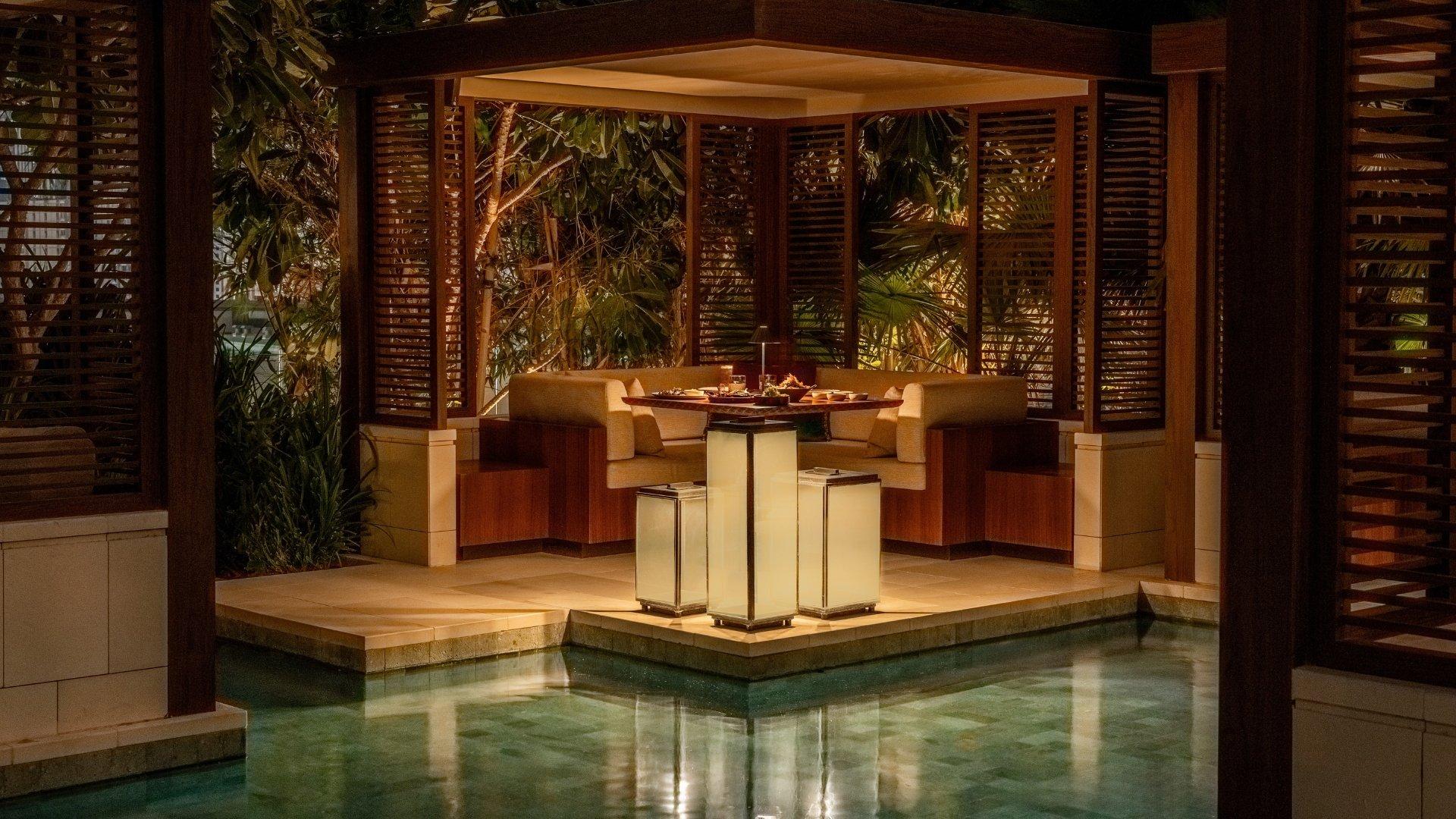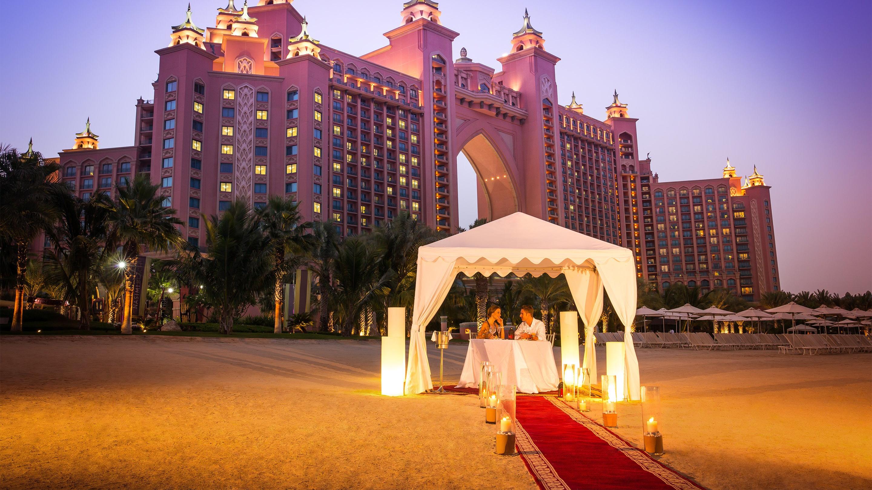 ake romance to new heights with a private dinner on Palm Beach in the exclusive comforts of a private gazebo. Enjoy a romantic evening featuring a seven-course set menu, live pianist, free-flowing Champagne, and a gift for the lady of a beautiful Tiffany & Co necklace, chocolates and a flower bouquet. AED 35,000 per couple.